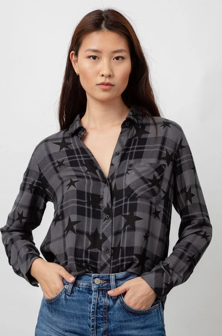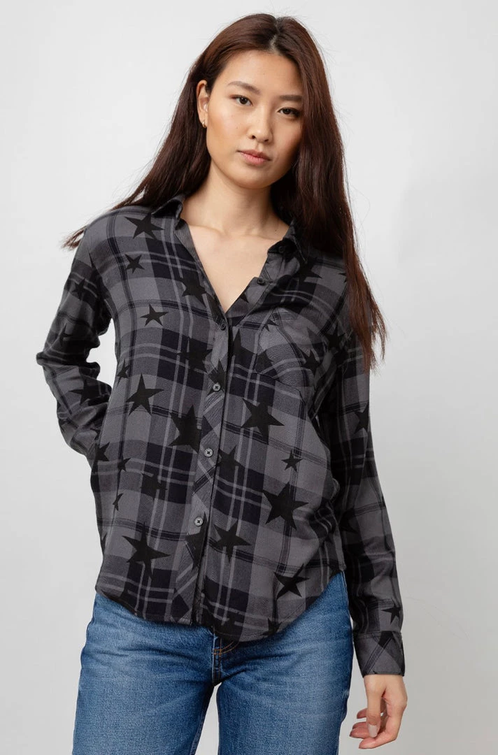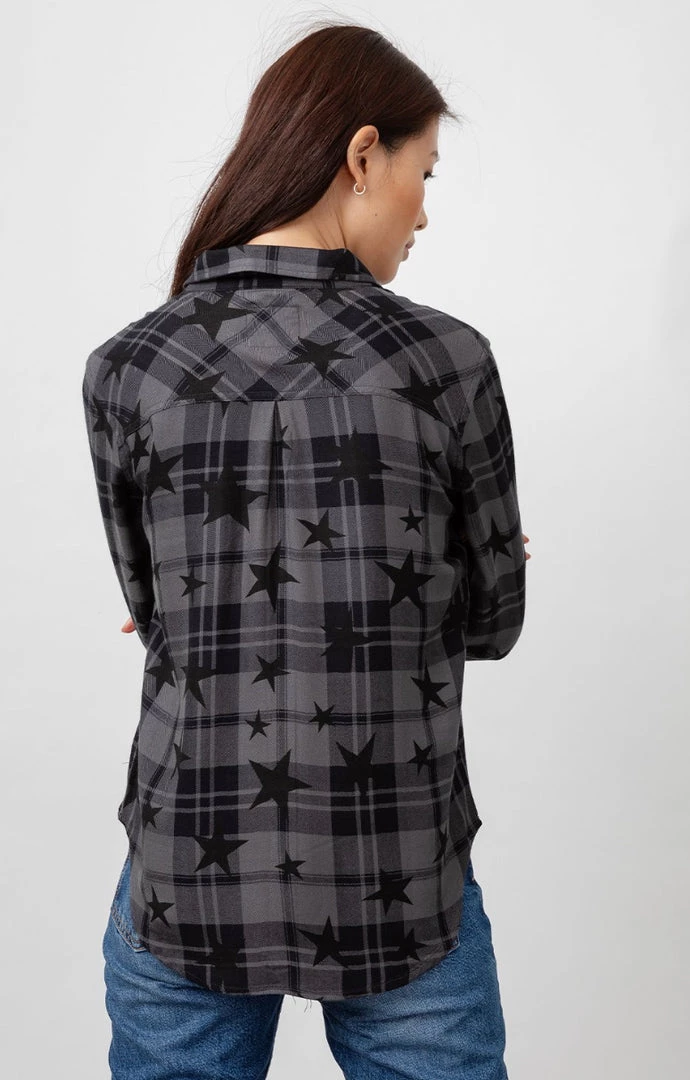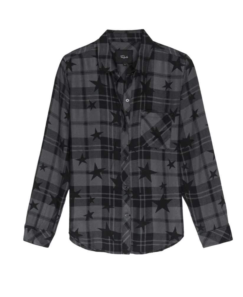 The classic RAILS long sleeve plaid buttondown shirt with an updated star print. Made from our signature, ultra soft rayon fabric featuring a loose twill weave. This style is a year-round comfort classic with jet black plaid and star print on a charcoal grey base. Single layer with one chest pocket.