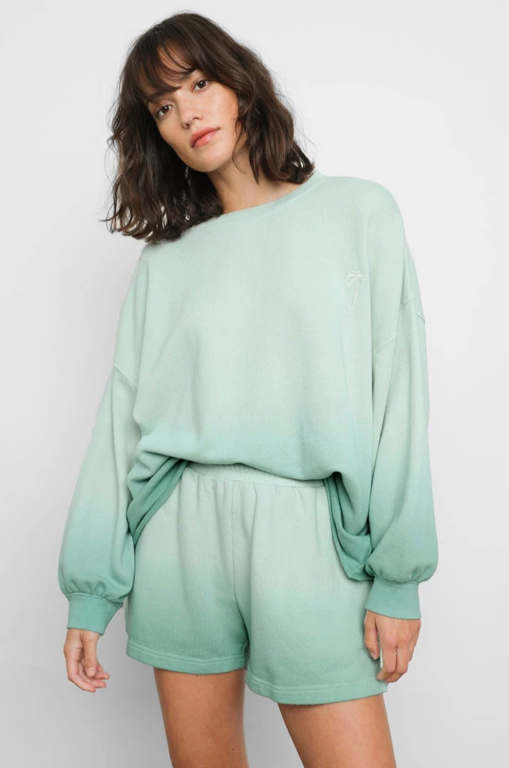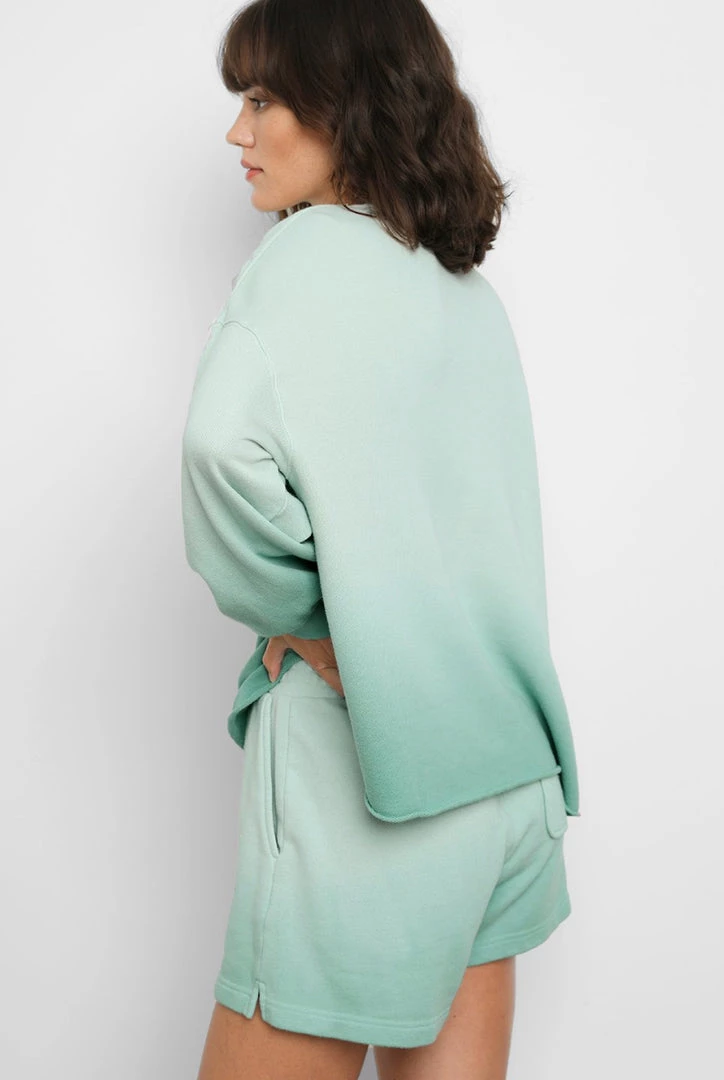 Super soft, lounge terry, high rise, unlined, mint green sweat shorts featuring tonal jade green dip dye design, relaxed fit, smocked elastic waistband, front pockets, back patch pocket, wide leg, and flattering side slits. These resort ready, vintage athleticwear inspired pullover shorts are hand-dyed for a unique, one-of-a-kind look.