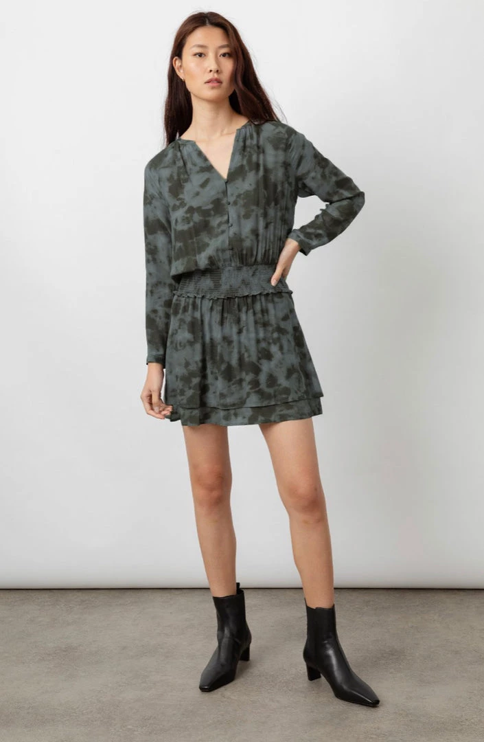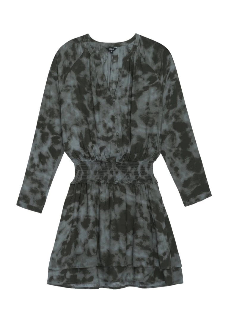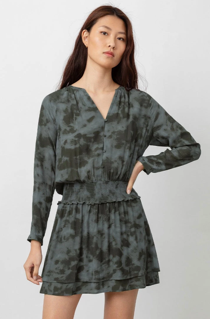 Ultra lightweight, rayon challis, long sleeve, unlined, slate grey mini dress featuring coal black tie dye design throughout, v-neckline, front loop fabric covered buttons, classic fit, cap sleeves, smocked elastic waist, and double layered tiered skirt. A pullover style dress with elastic waistline and flowy skirt make for easy wearability with a feminine touch.
