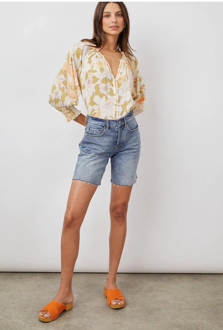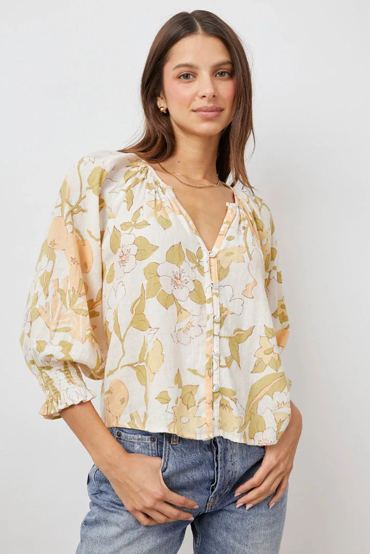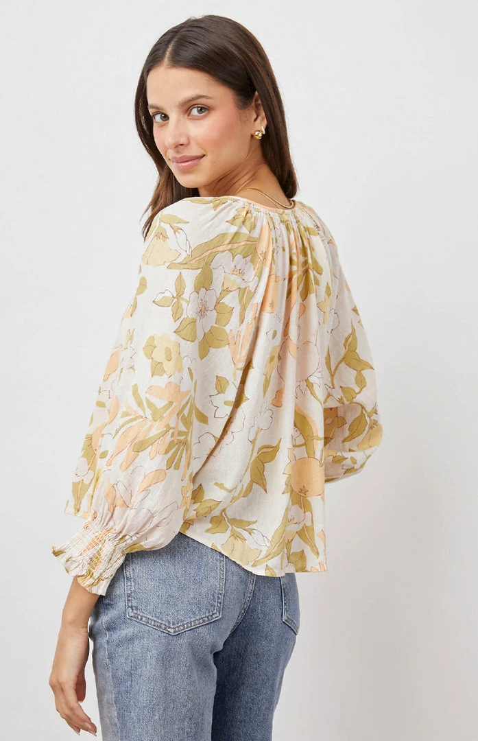 Lightweight and made from luxe linen, this pretty pullover top features natural shell buttons, elastic smocked detailing at cuffs, and a relaxed fit.