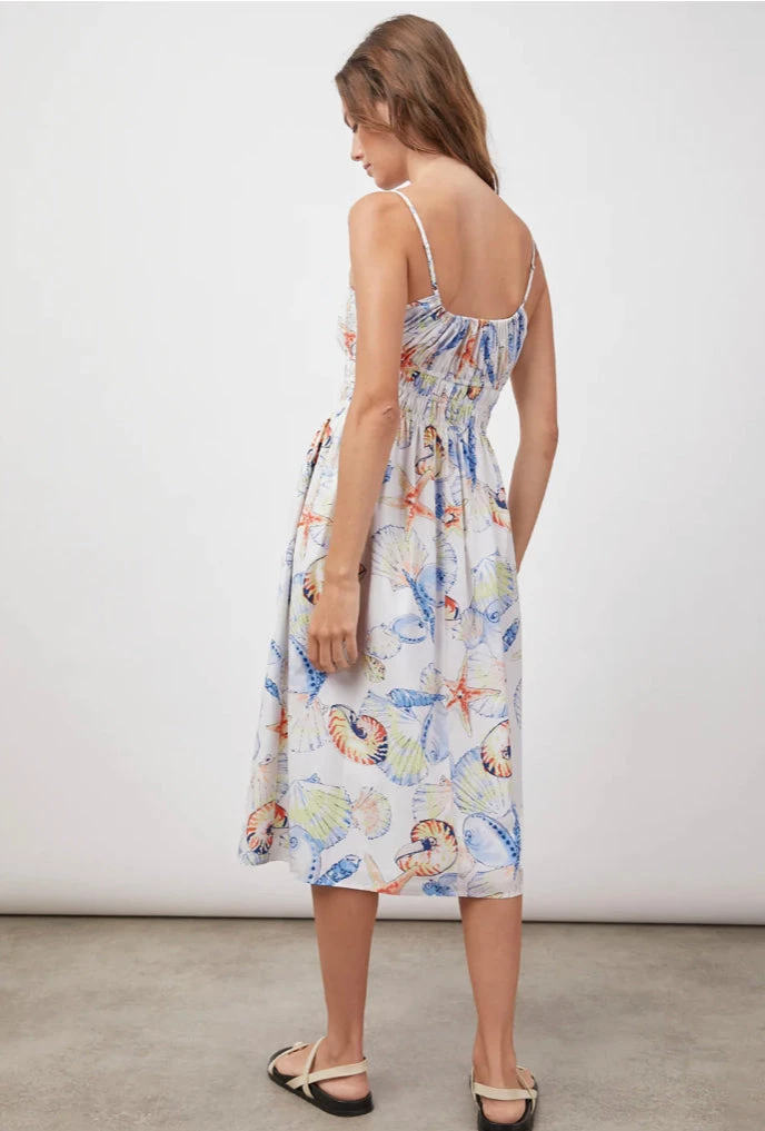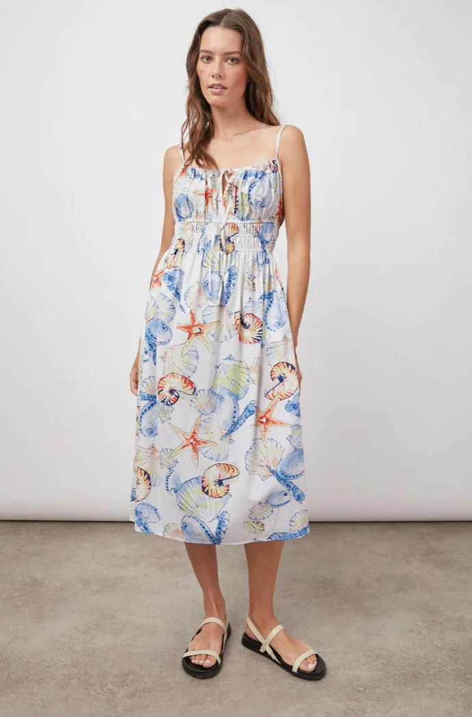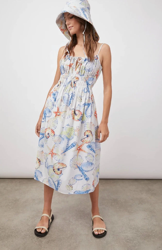 Elevate your summer wardrobe with this seashell print midi dress. This lightweight midi dress is made from crisp cotton poplin and features thin adjustable shoulder straps, a keyhole at center front, elastic at the waistline and a lined skirt.