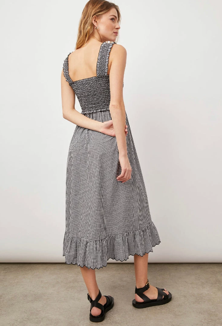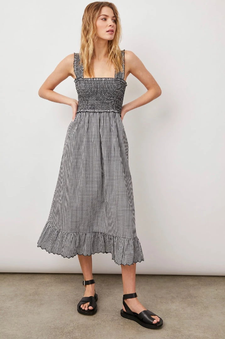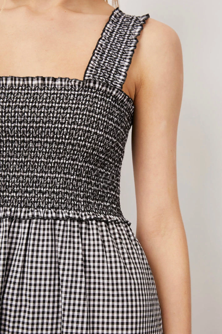 This timelessĀ midi length dress comes in aĀ black gingham print with feminine ruffle details. Made from lightweight cotton poplin, this midi dress features a square neckline, swingy fit, smocked bodice, and wide shoulder straps.