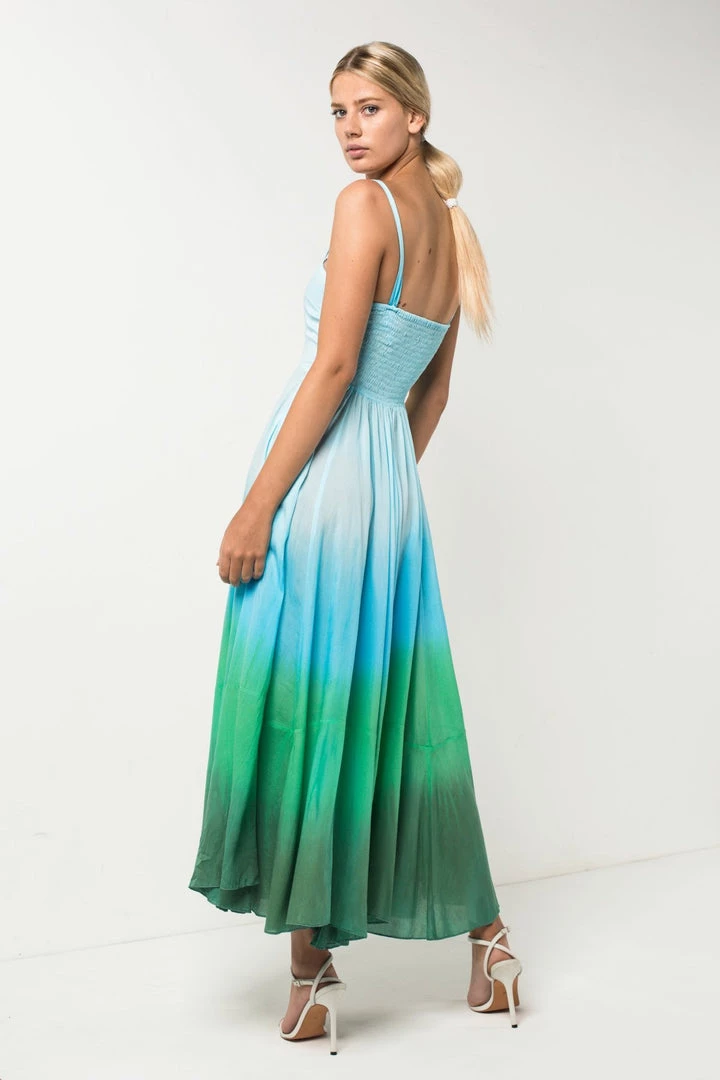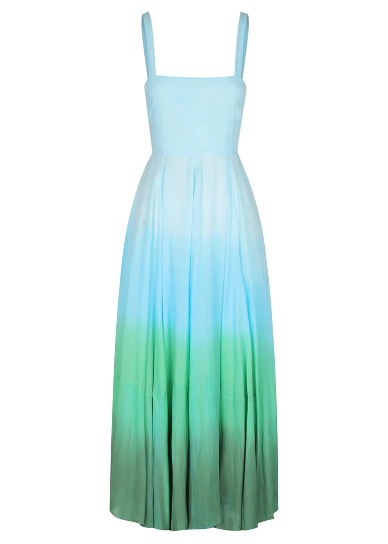This simple and elegant maxi dress features an on-trend squared neckline, shirring in the back body with wide straps and a full flowing skirt.