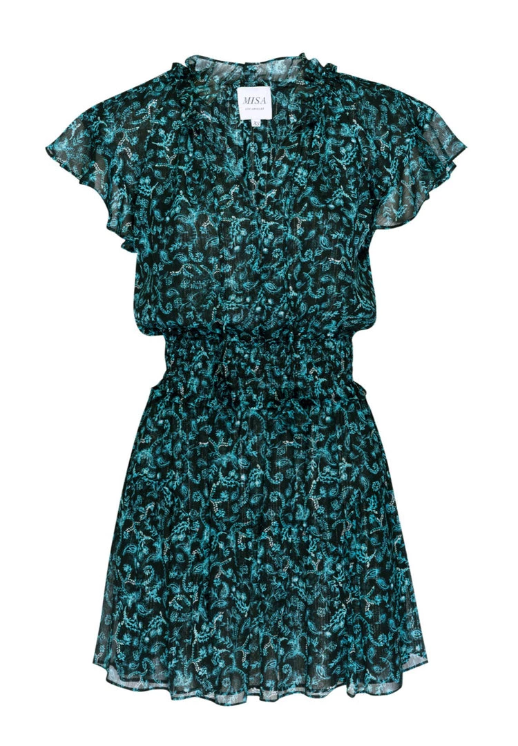 Feminine and sophisticated, the Lyra dress is a new, chic mini silhouettes featuring cap sleeves and a layered skirt with ruffles. Cut from an a teal, shimmer printed chiffon, this sweet mini is all about the details with ruffle trim and a split neckline finished with our signature petal ties. This effortless style is the perfect weekday to getaway dress.