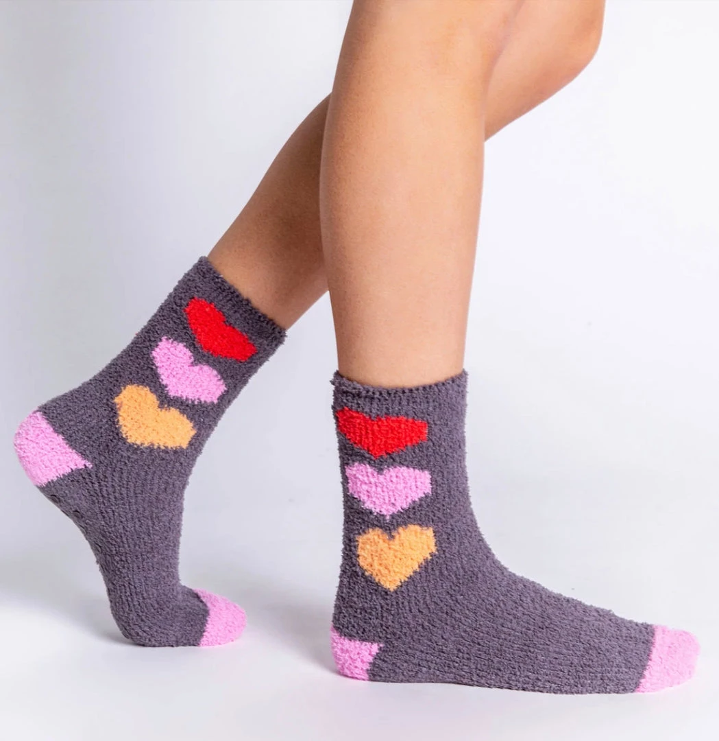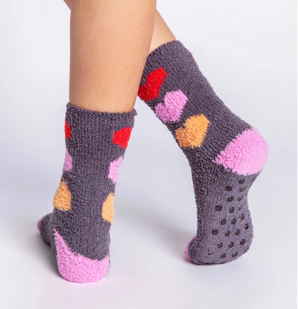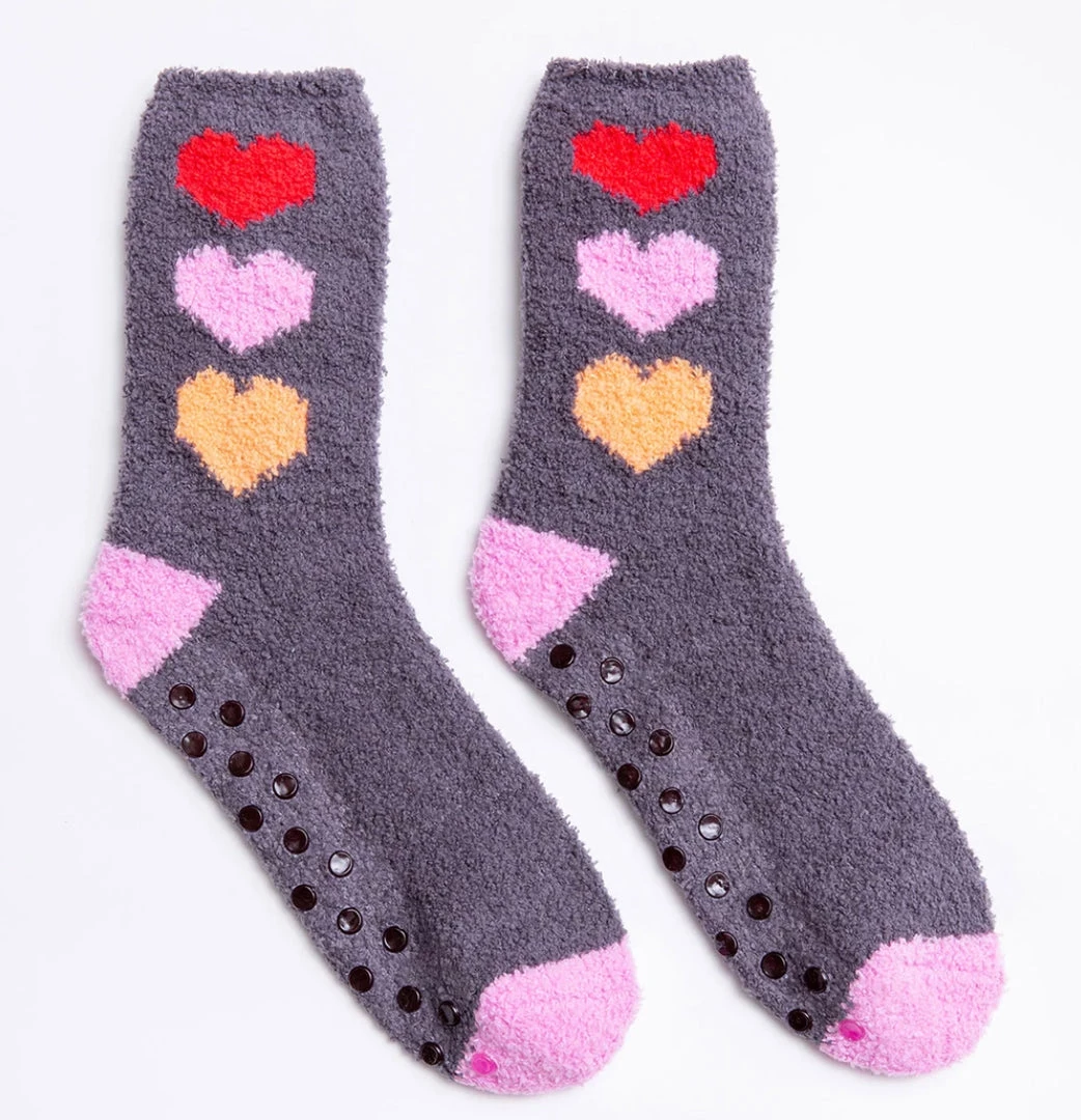 DESCRIPTION: Cozy socks with all the love. Extra soft charcoal with multi-colored hearts. Grippers on sole for non-skid wear.