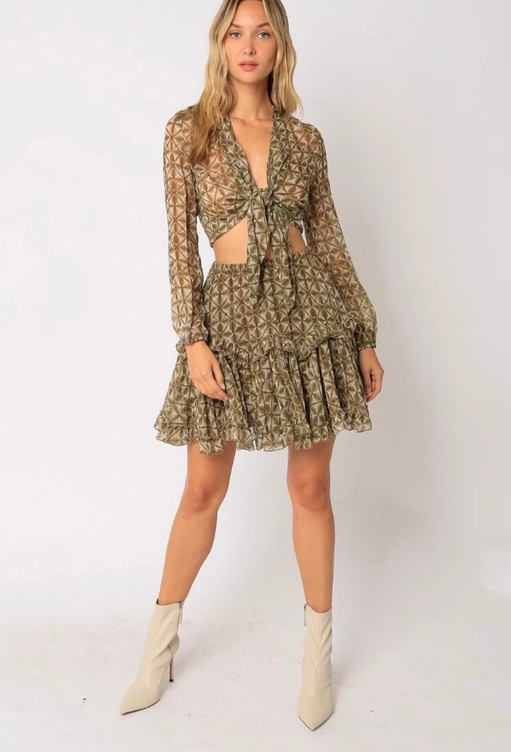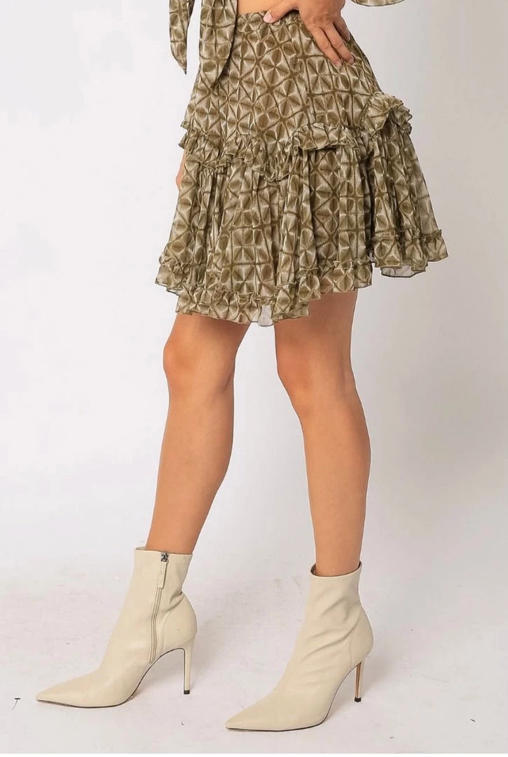 Our Olive Geo Miniskirt features ruffled trims and an elastic waist.