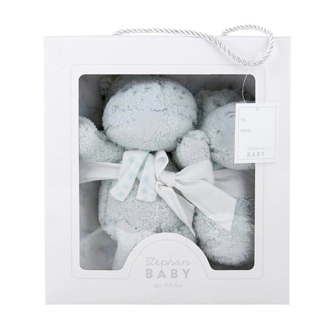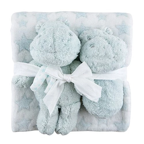 This Hippo blanket / toy gift set is perfect for all babies! It includes matching blanket, stuffed toy, and a rattle. Boxed and gift ready!