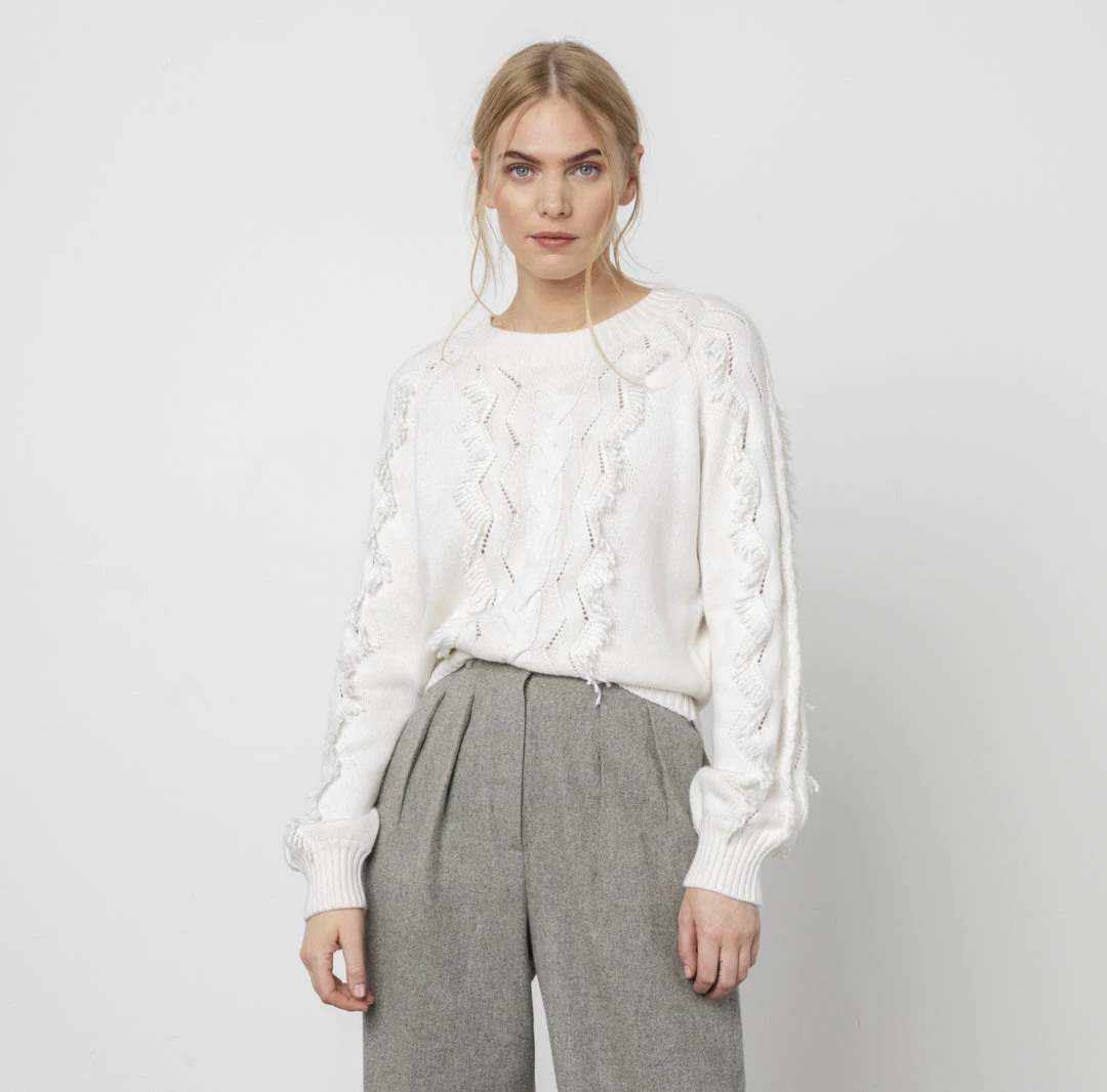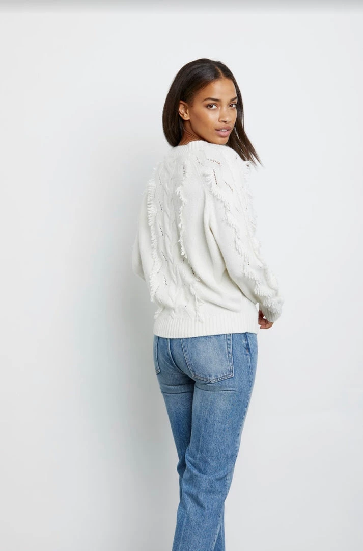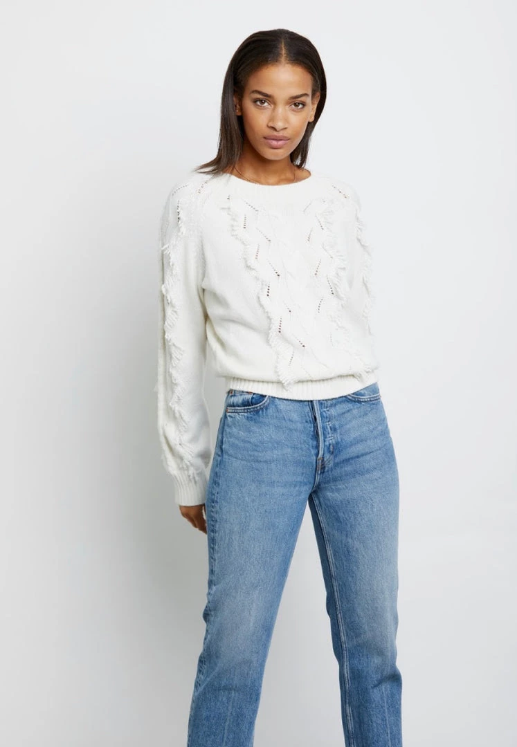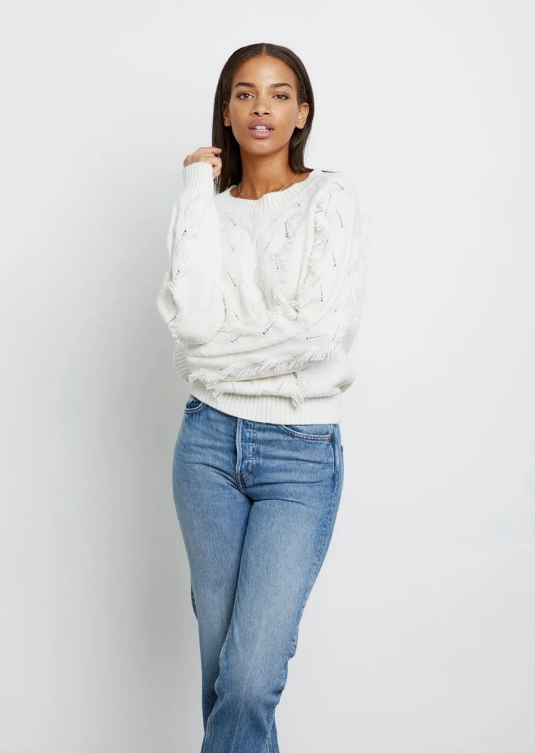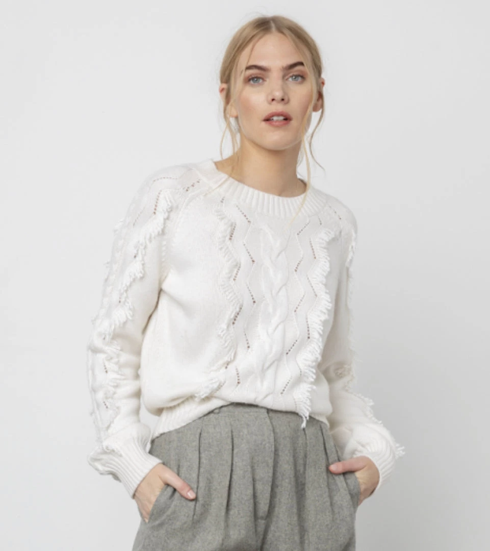 This Rails Francis sweater in ivory is sure to become your new favorite sweater with is accents of cable knit and fringe.