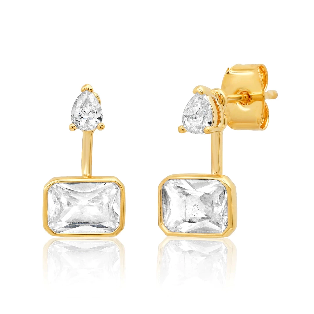 Bezel set emerald cut stone ear jackets with a sparkling CZ pear shaped stud. Wear alone or in a stack for just the right amount of shine.