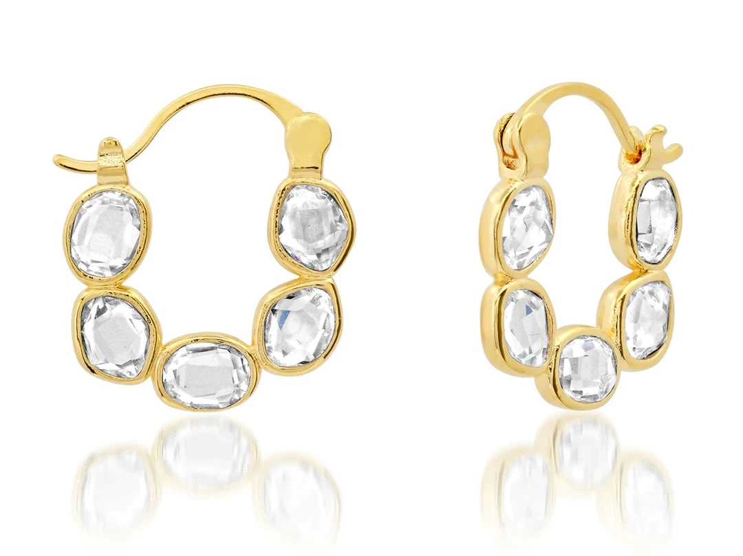 Gaze into the beauty of these ethereal huggie hoops featuring faceted glass puddles in a luxurious bezel setting.