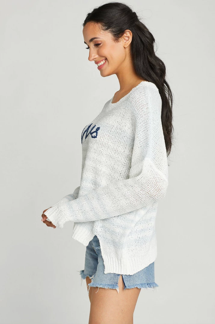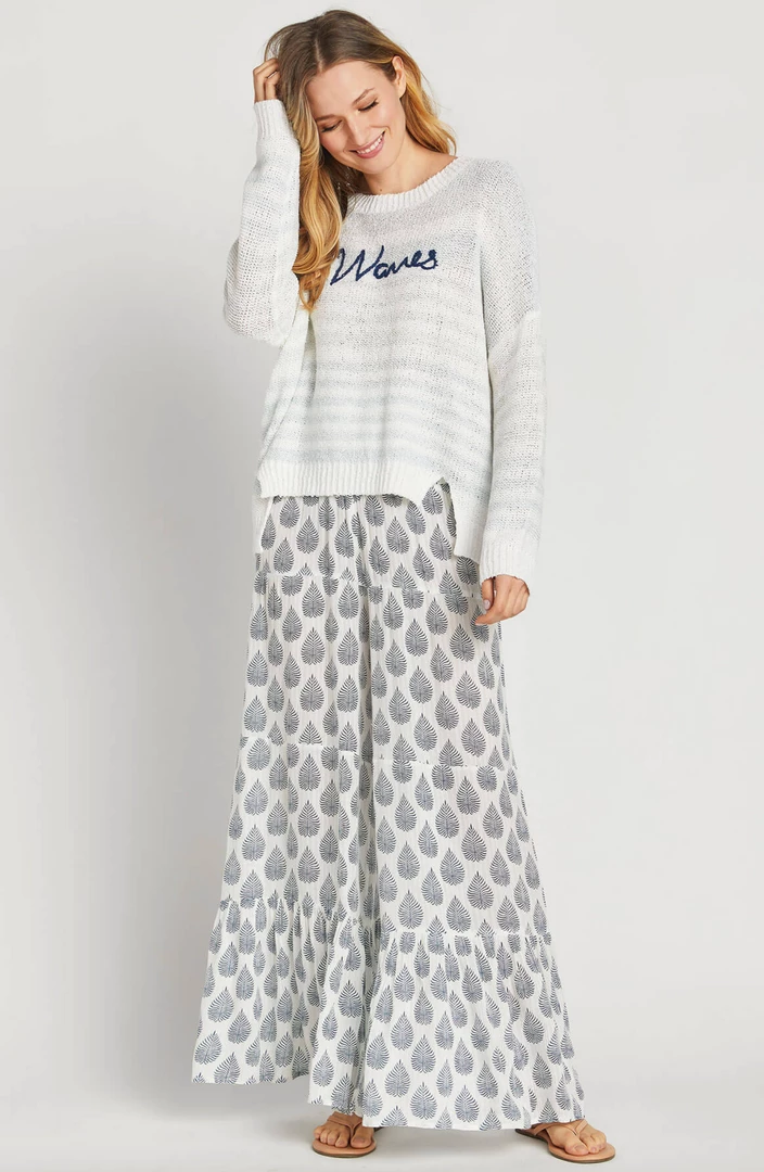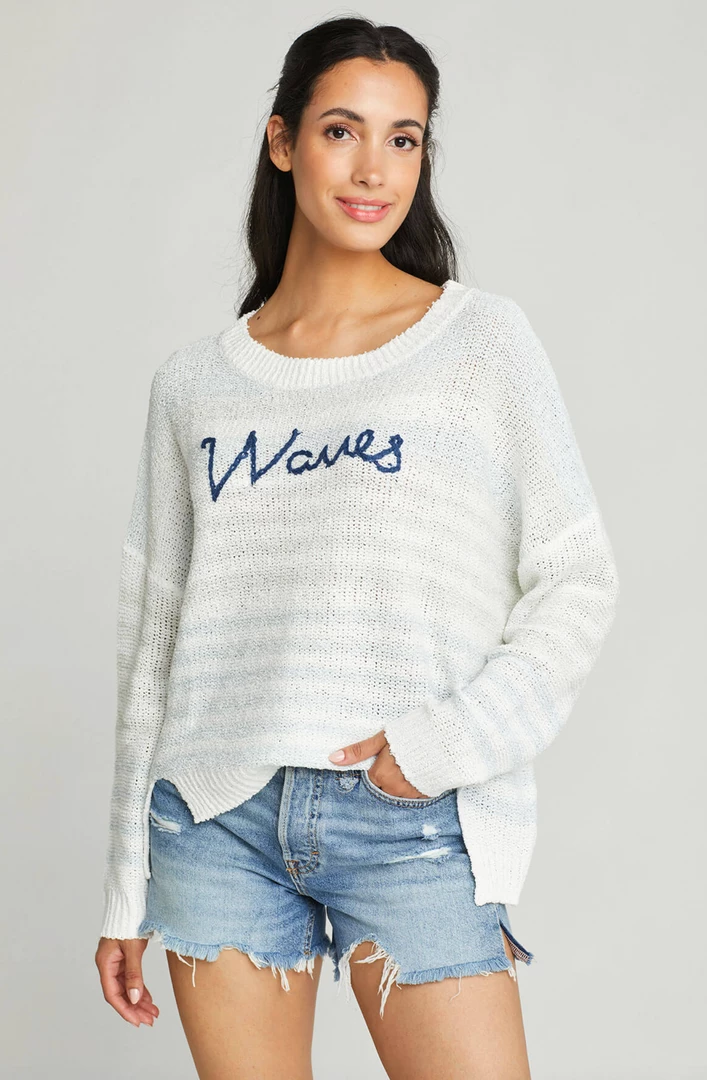Lightweight crewneck stripe sweater with embroidered ‘Waves’ graphic. Great with shorts, beach pants or your favorite jeans!