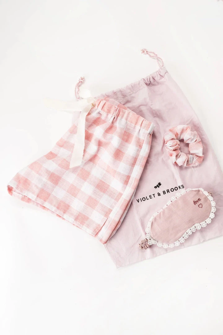 - Set includes a pair of shorts, scrunchie, and sleep mask, all in a cotton bag