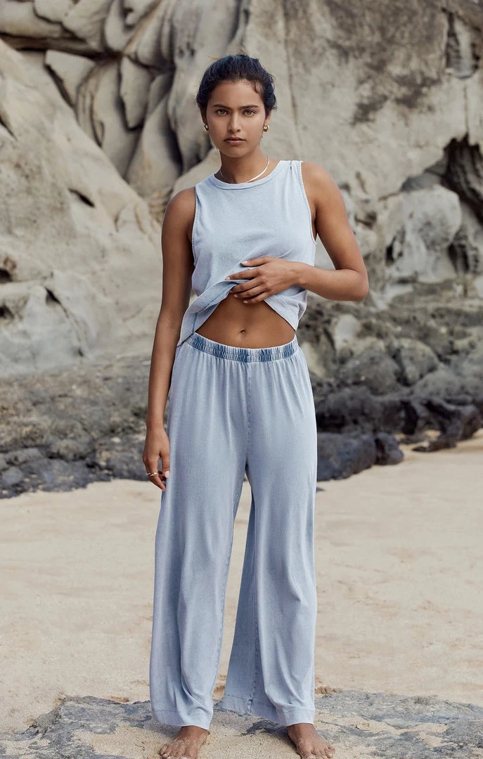 Mid rise + flare = a trend we’re loving! With its vintage look and soft mineral wash, the 100% cotton Scout Jersey Denim Pant is a relaxed denim dream. The elastic waistband and smooth silhouette makes an easy-to-wear style that matches with our Sloane Jersey Denim Muscle Tank!