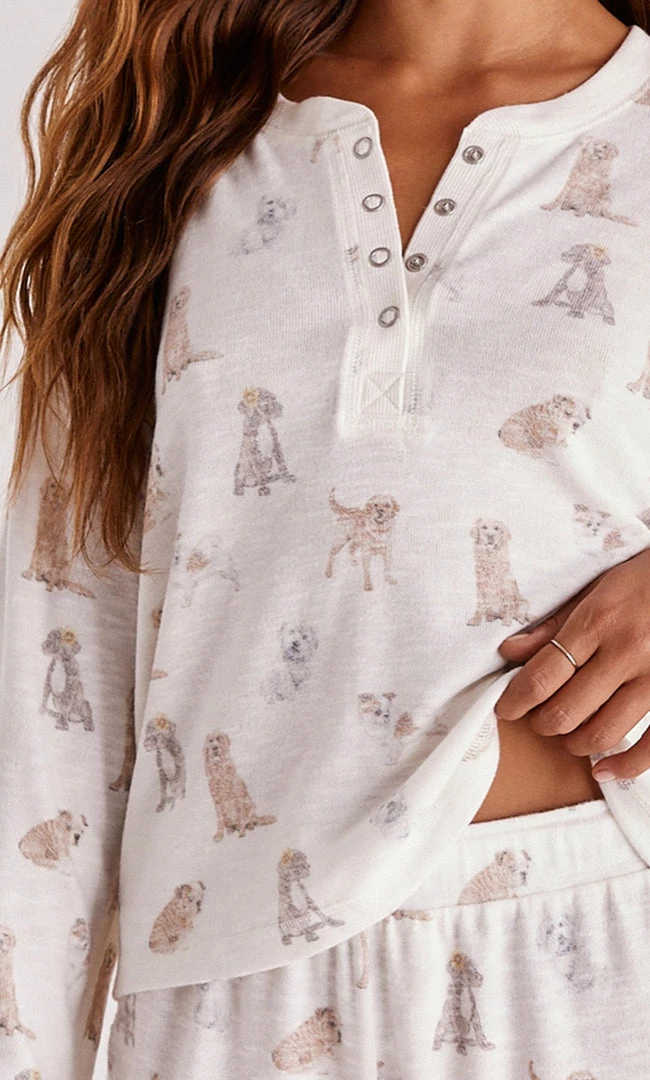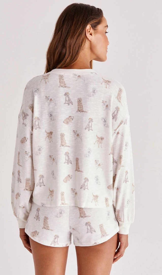 Dogs are the best and what better way to show it than with the most adorable print ever? The Snuggle Up Dog Long Sleeve Top features a crew neckline with button front opening, balloon sleeves and ribbed details. The cropped, relaxed body is so comfy and looks so cute paired with the Mia Dog Short or Chill Out Dog Jogger.